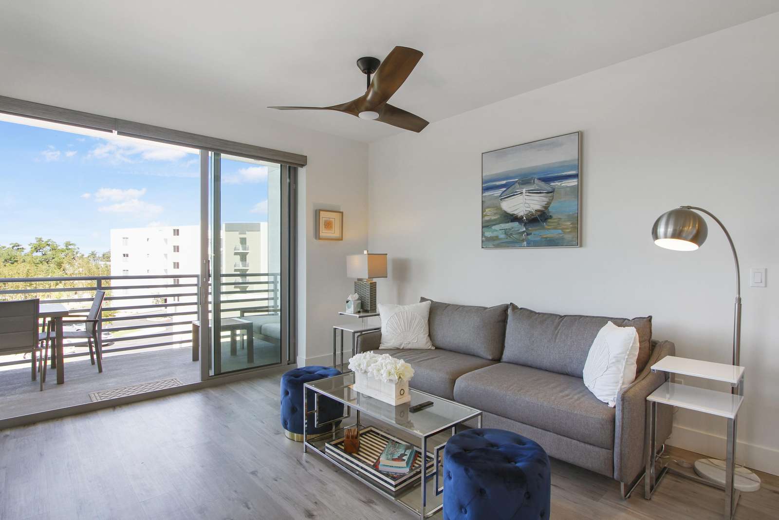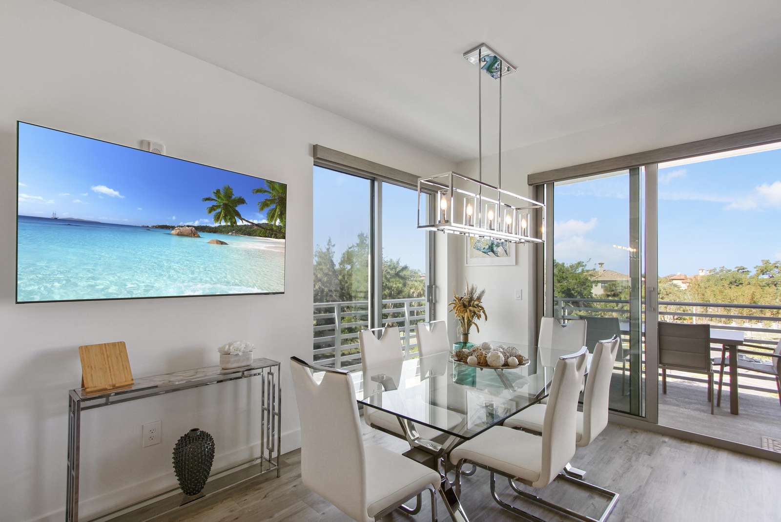 It features a grey couch, a large glass dining table that comfortably seats 6, a flat screen smart TV and large sliding doors to access the terrace with its outdoor furniture table and couch.