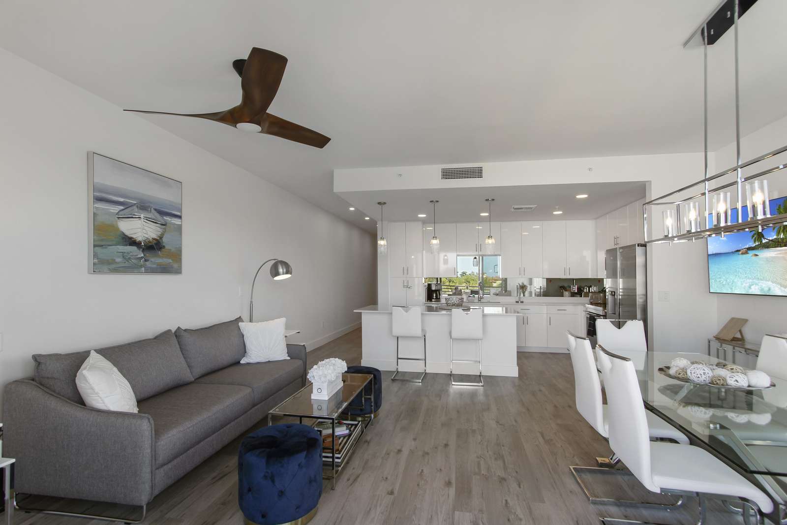 As you enter this charming condo, the hallway on the right-hand side will lead you to the luminous living room and an open-floor plan kitchen.