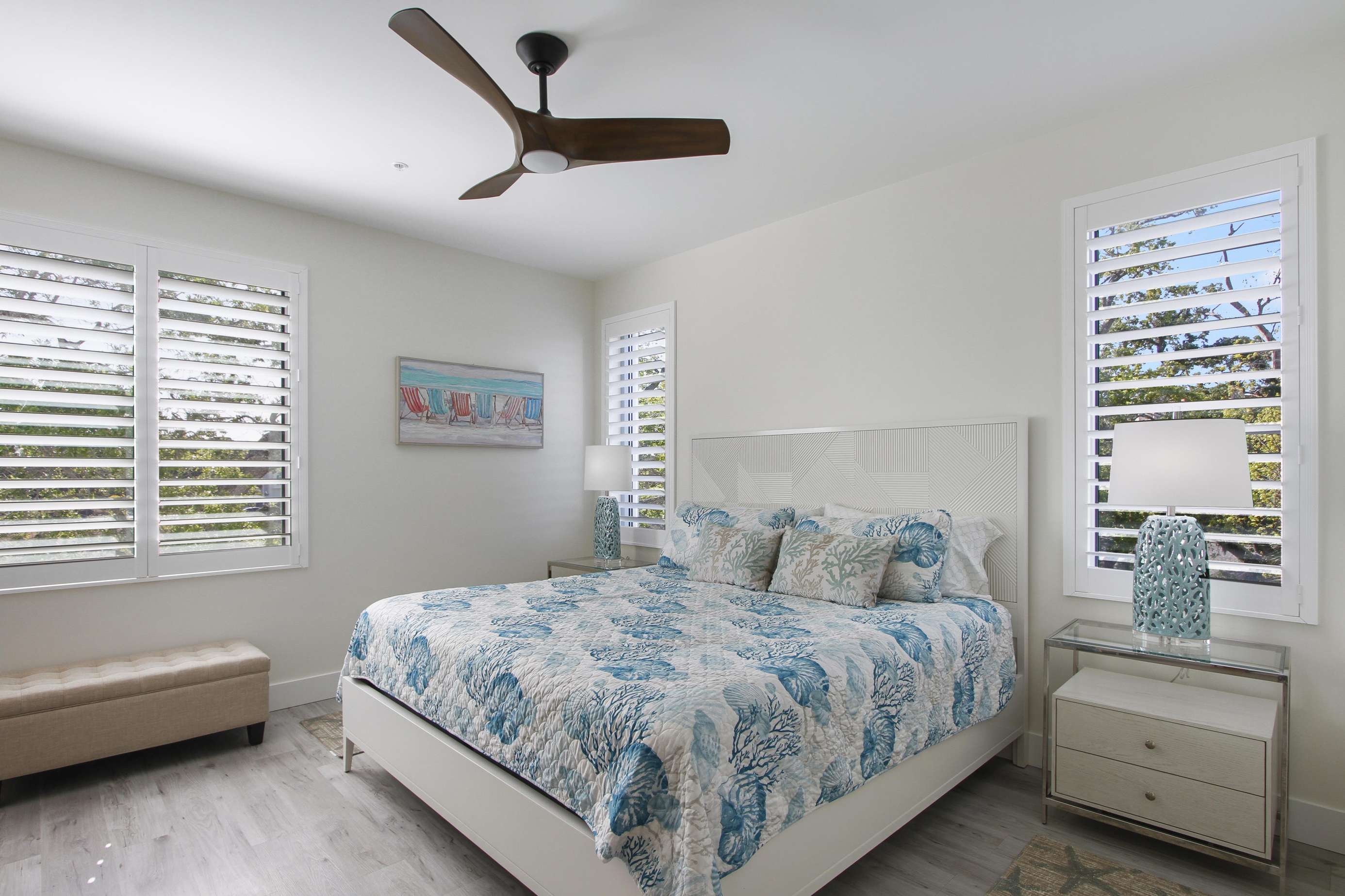 The master bedroom is very elegant with its beach theme and decoration in shades of green. It features 3 windows, a TV, a chest of drawers, a king size bed, night stands, lamps, and a nice walk-in closet.