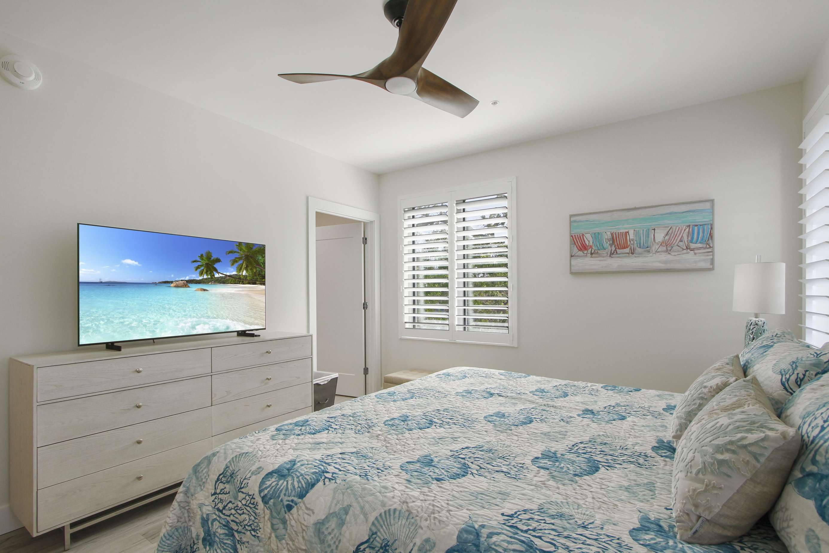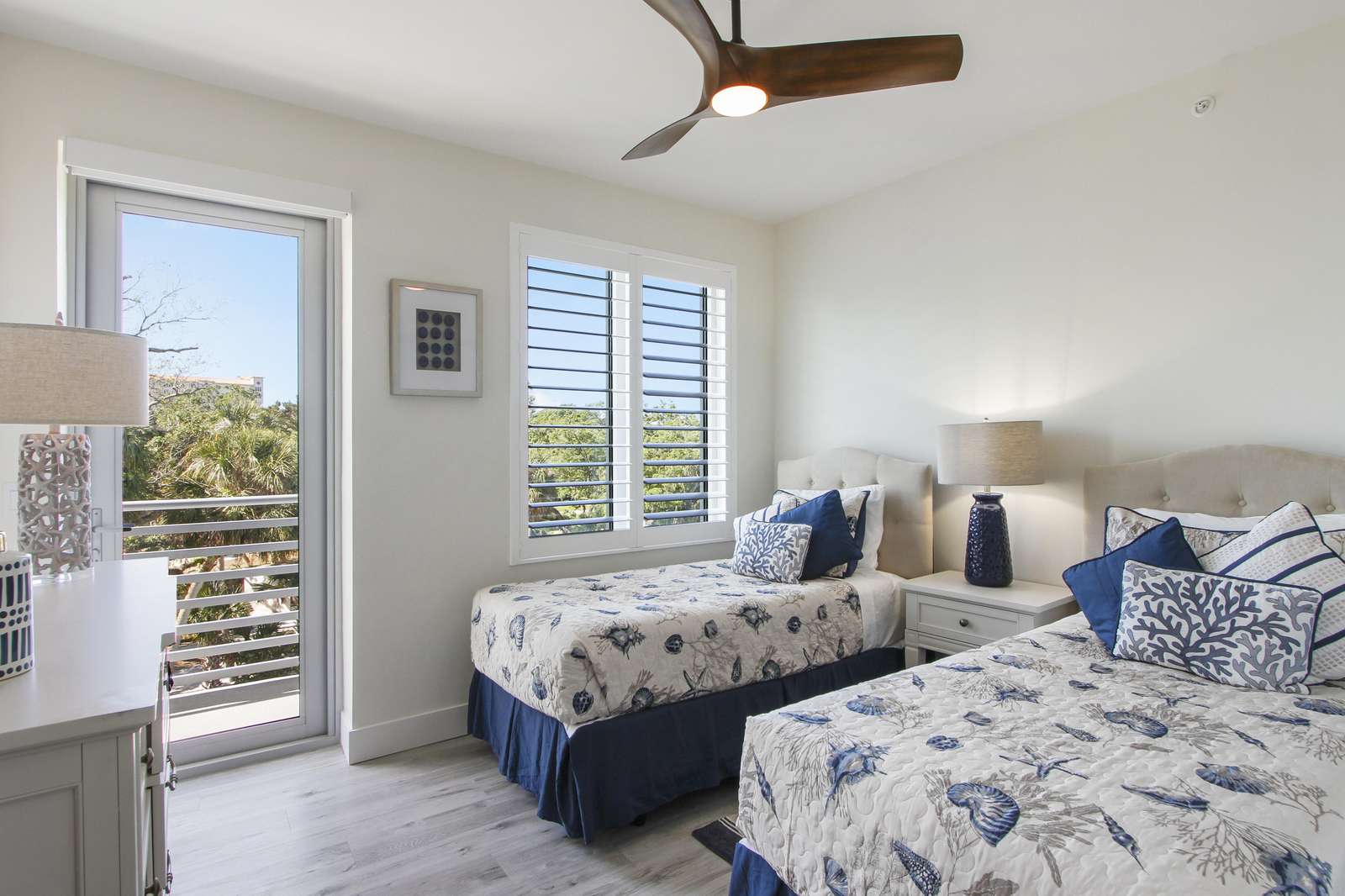 The 2nd bedroom keeps the beach theme in shades of blue. It includes 2 twin size beds, a night stand and lamp, chest of drawers and a closet with hangers. A door accesses the side terrace.