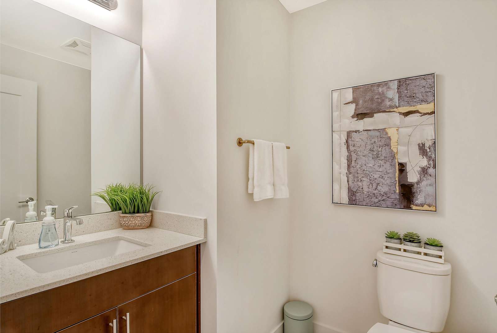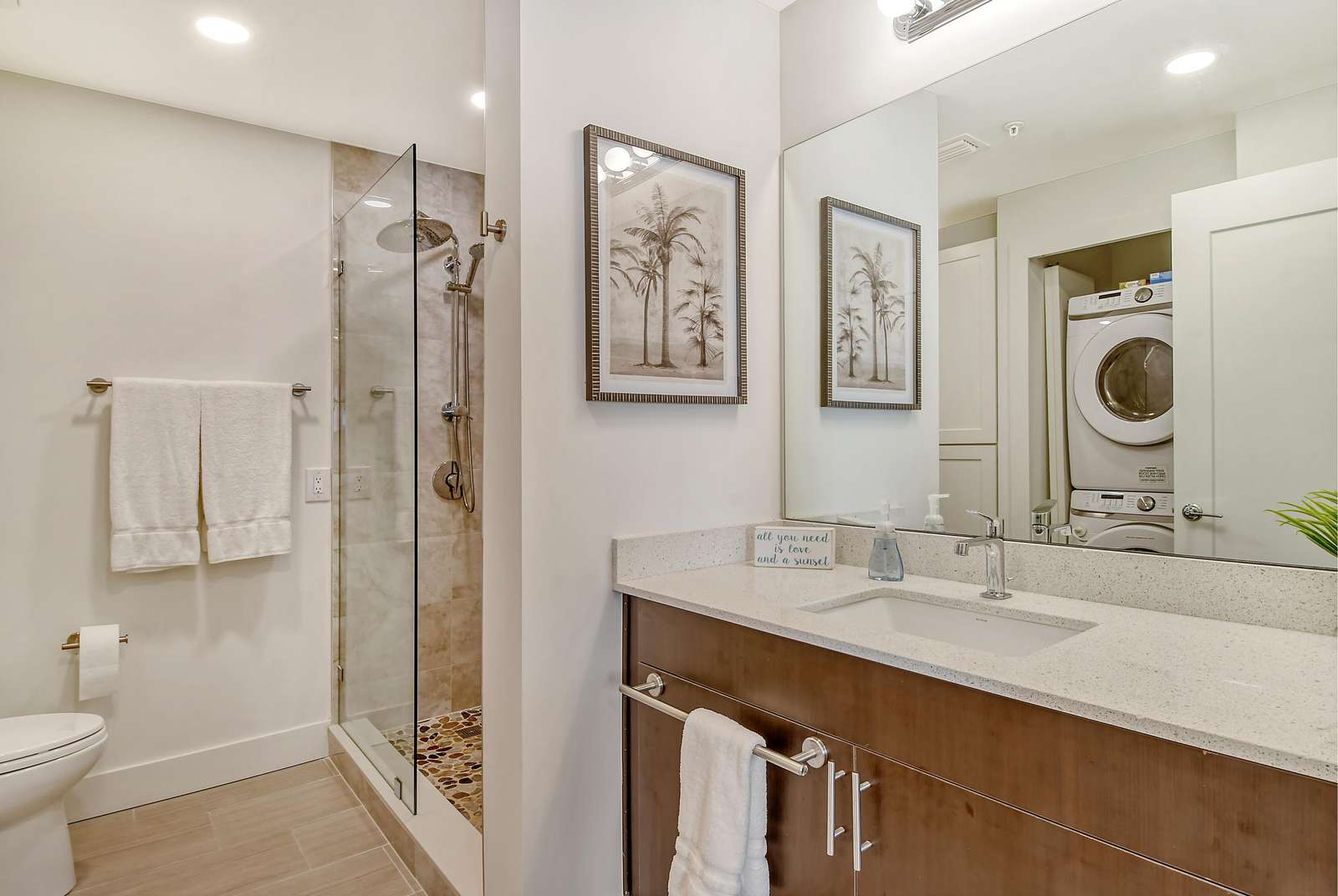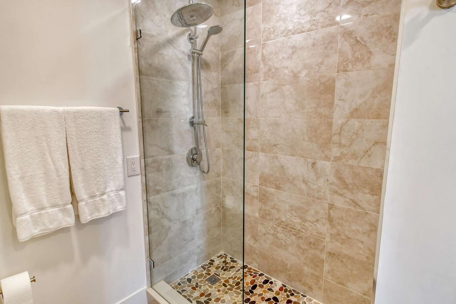 The master bath is connected to the bedroom. It features a large walk-in shower, sink and toilet.