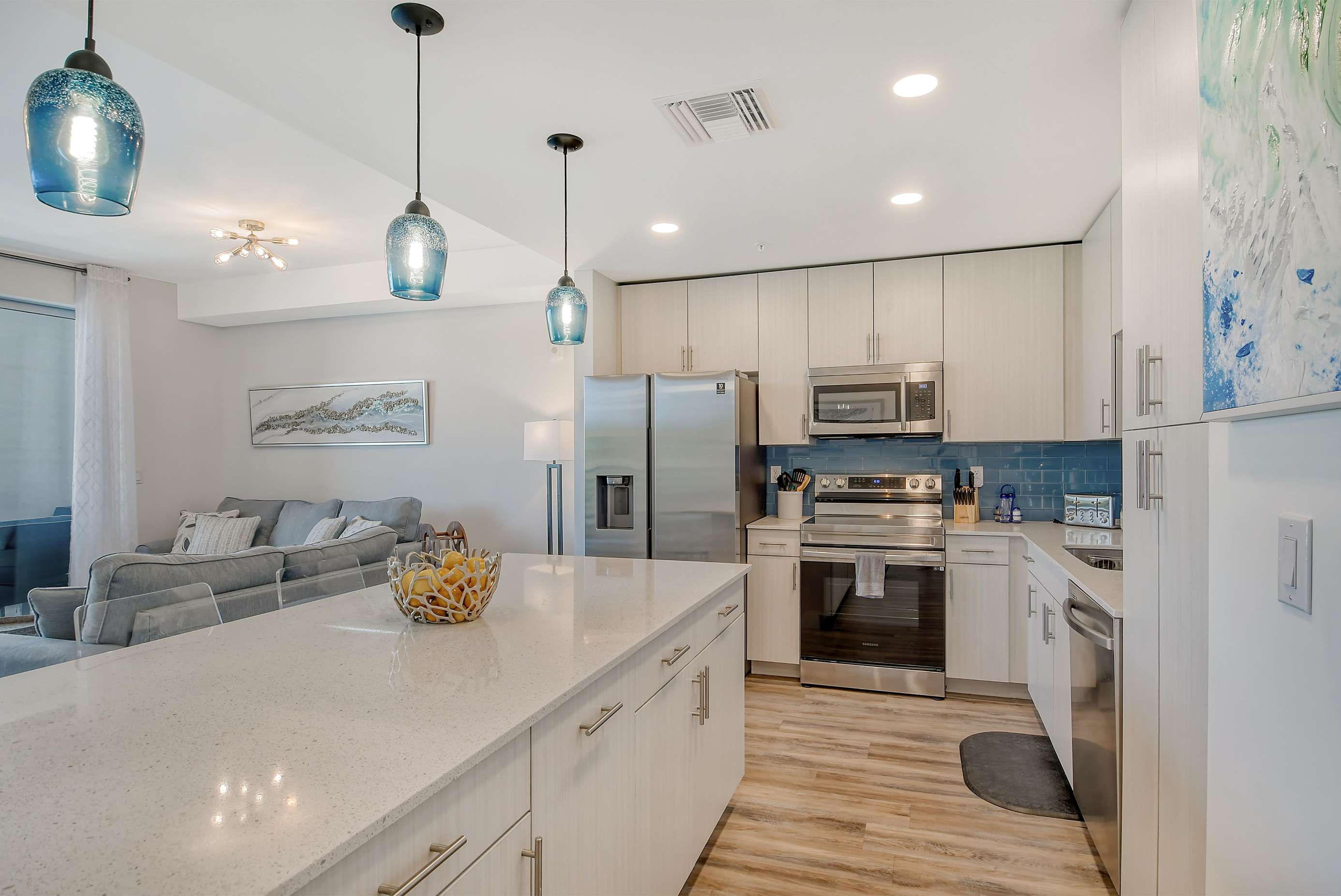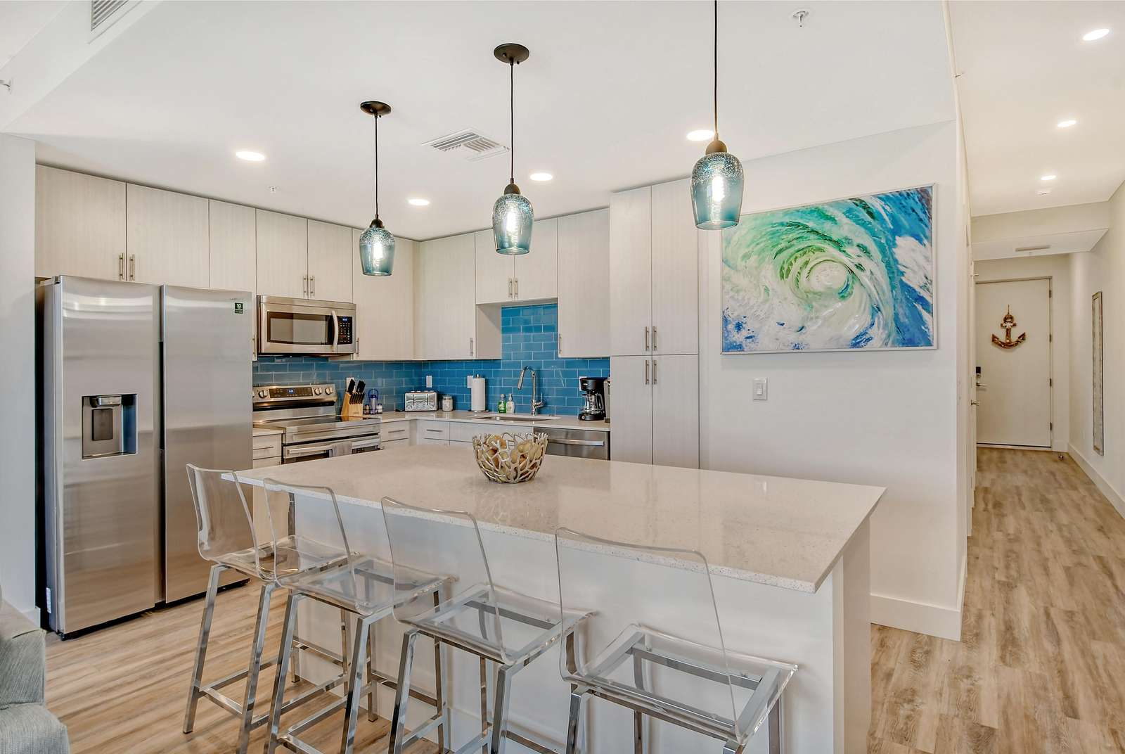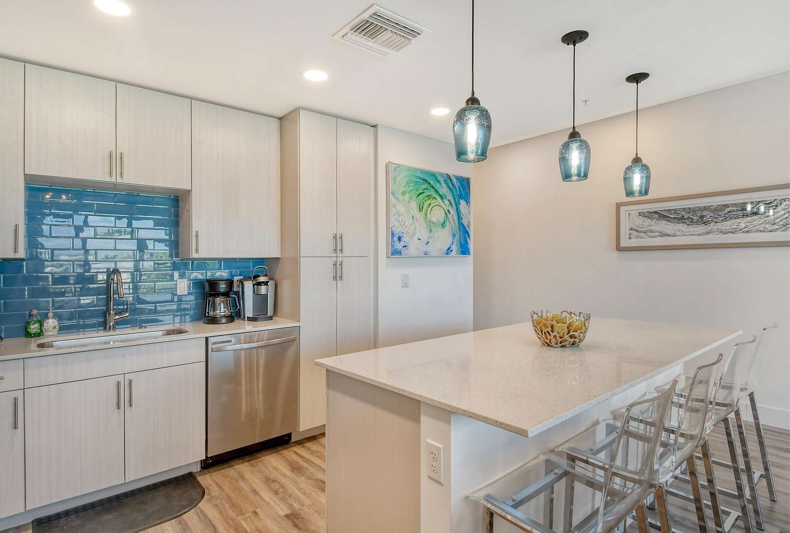 The kitchen features brand new appliances such as a stove, oven, microwave, fridge, dishwasher, toaster, kettle, drip coffee maker, and a Keurig. It has four bar stools at the kitchen island for dining.